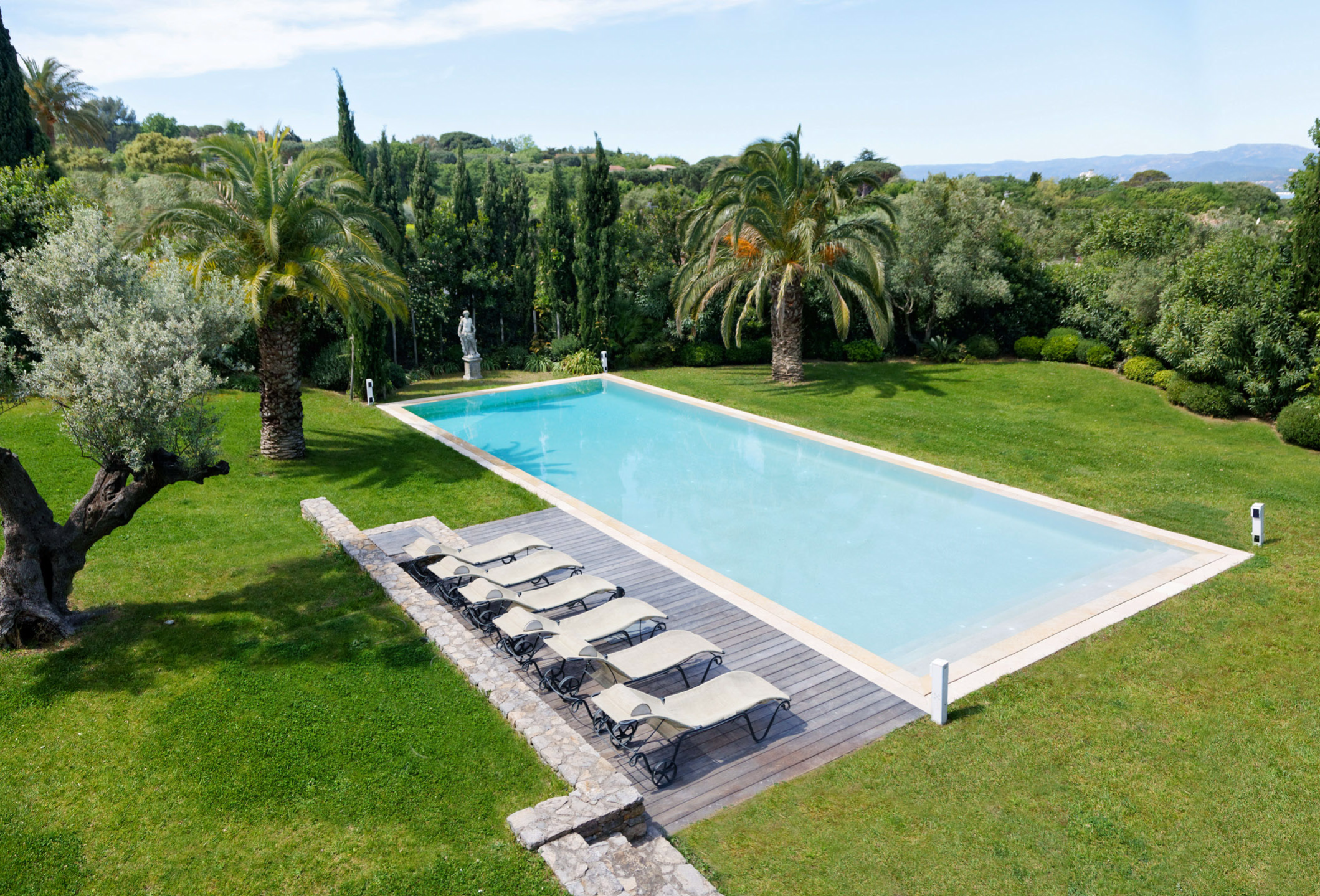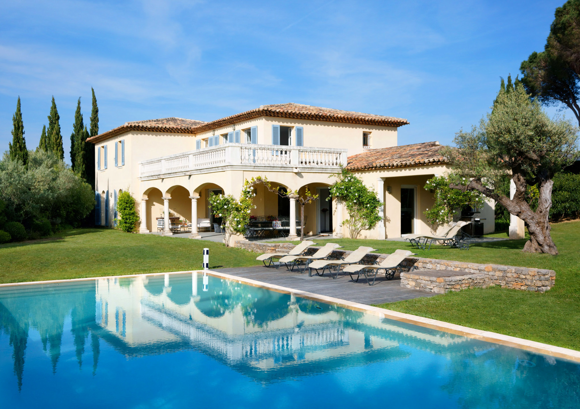 This luxurious villa 6 bedrooms fully air-conditionned is minutes walk from St-Tropez, close to the beaches of Pampelonne in a landscaped garden with many roses, laurels, palms, olives trees.
