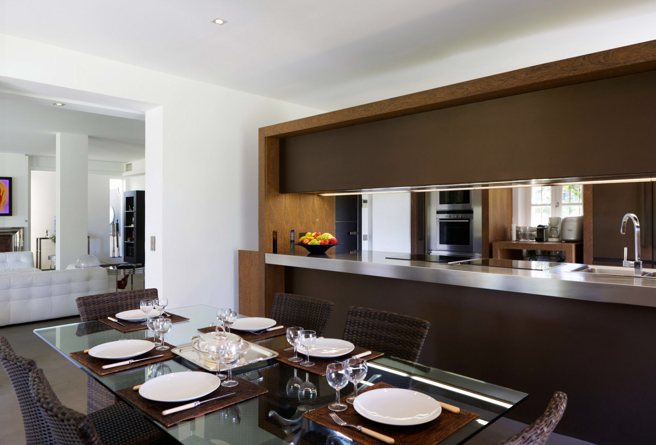 La cuisine professionnelle Armani casa est ouverte sur la salle à manger mais peut également se fermer si on le désire. Elle comprend trois congélateurs, deux frigidaires, deux machines à