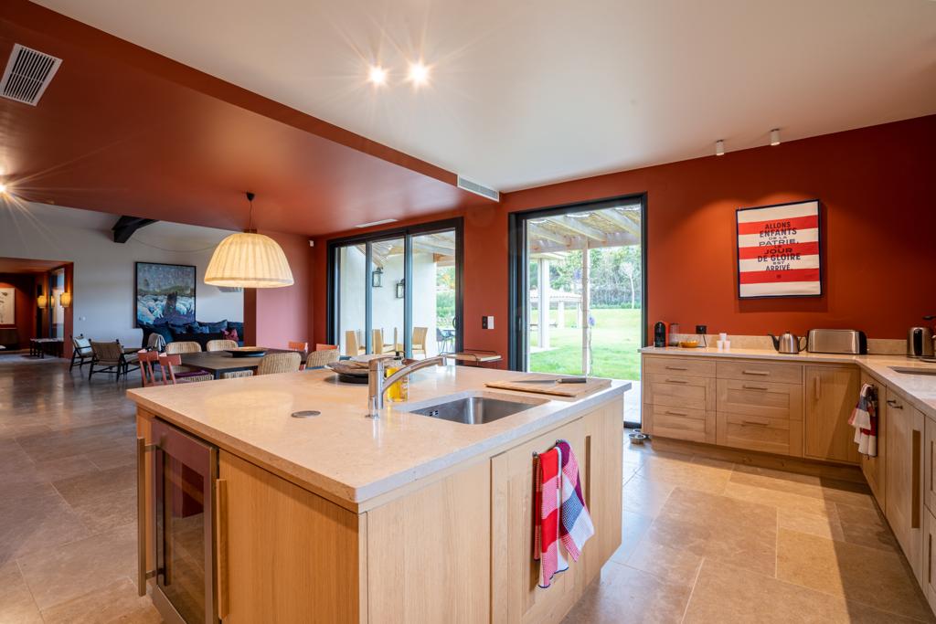 piscine, une cuisine ouverte avec ilot, une buanderie dans le garage.